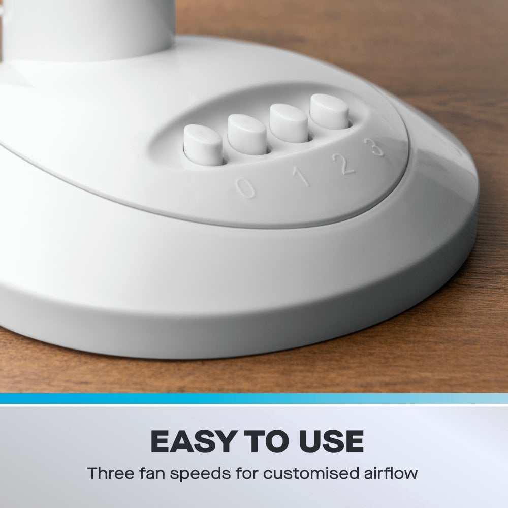 The Daewoo 12" Oscillating Desk / Table Fan in white is the perfect cooling solution for your home or office, combining functionality with affordability. Designed to fit comfortably on any desk or table, this fan provides powerful airflow while maintaining a compact footprint. Whether you need a refreshing breeze while working or want to cool down a room on a warm day, this fan delivers reliable and efficient performance.